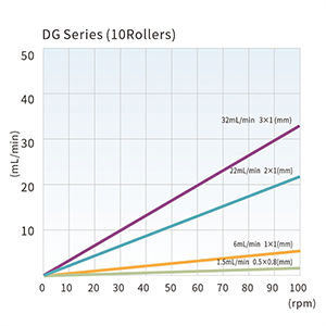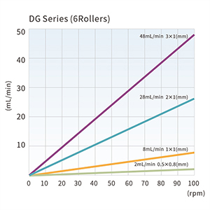 For applications requiring reduced pulsation and greater uniformity, a choice is available between 6‑roller and 10‑roller pump heads. The maximum flow rates are: